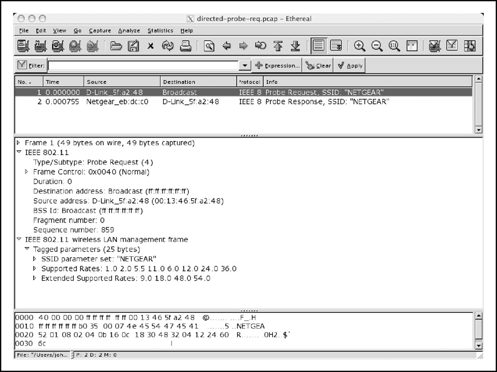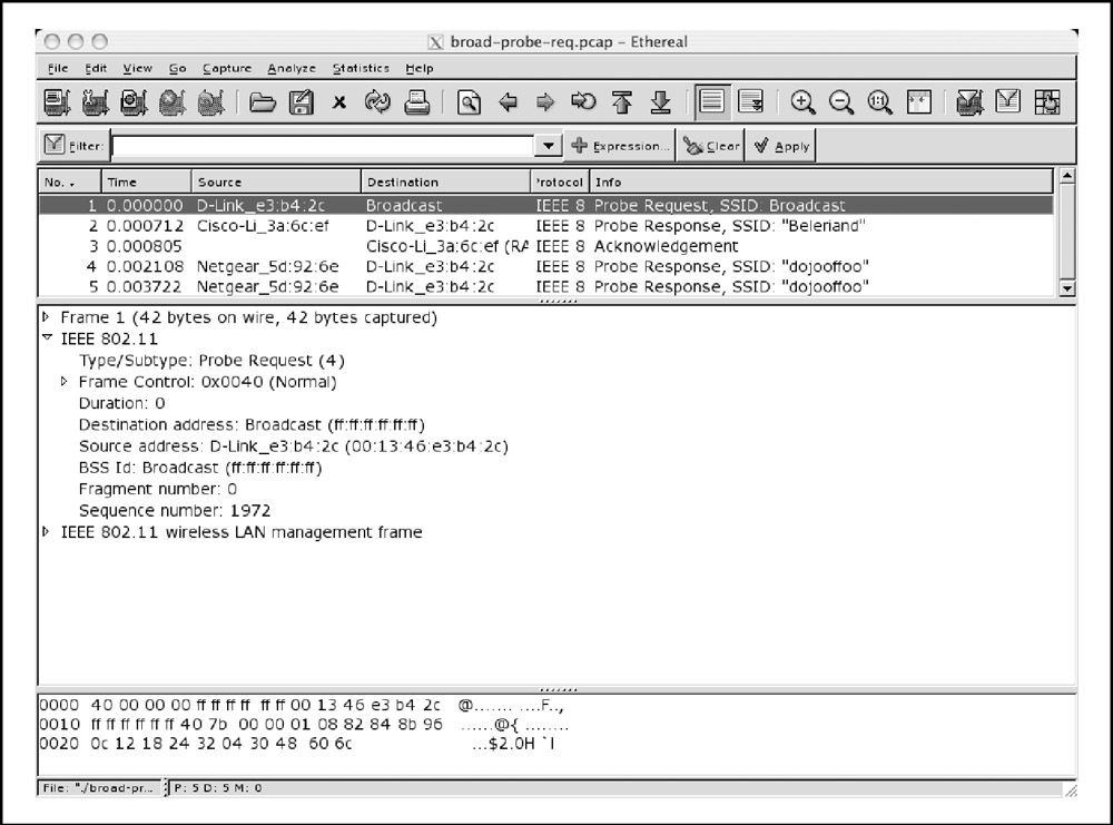 Whenever you are using Windows and click Refresh Network List, your card sends out a broadcast probe request packet. Wireless Zero Configuration (covered later) will also send out probe requests for all the networks that you are known to use. Many tools that implement active scanning will only be able to locate networks that your operating system could have found on its own (in other words, the ones that show up on your list of available networks), putting them at a significant disadvantage to tools that implement passive scanning.
