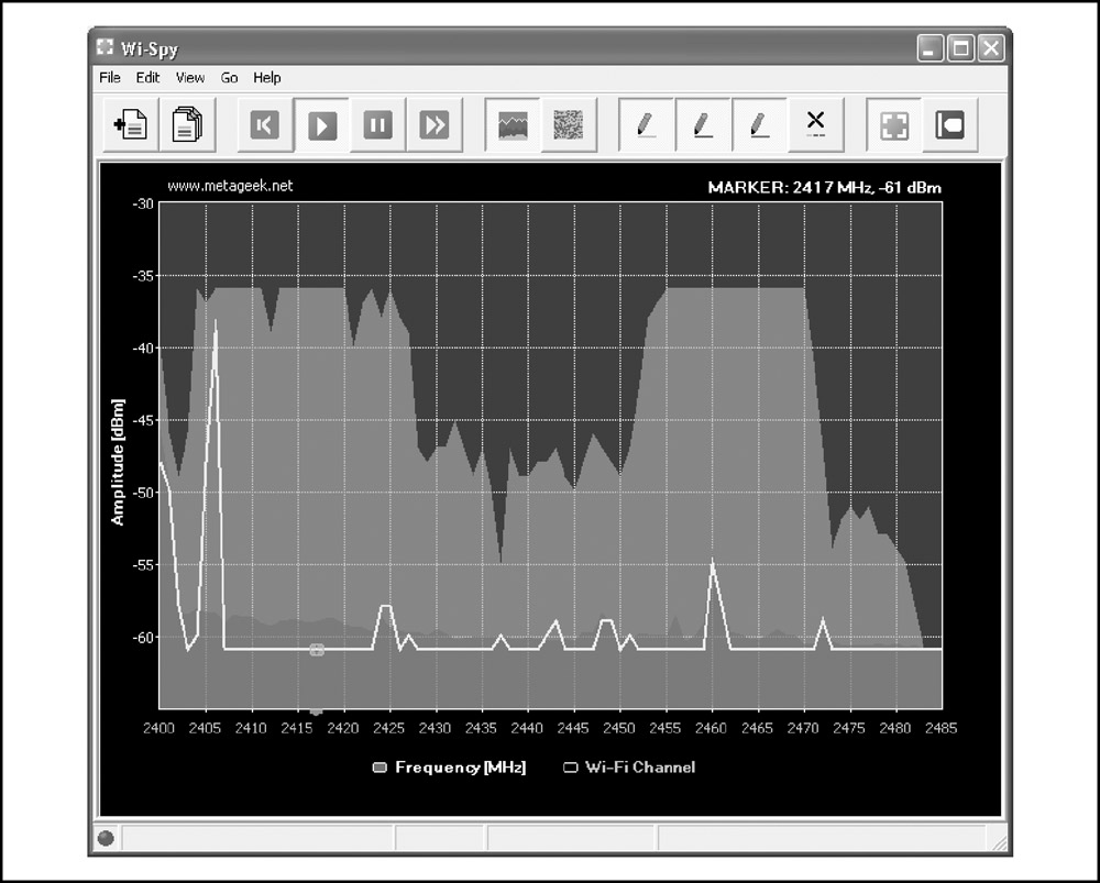A card in monitor mode will let you see all of the 802.11 traffic on a given channel, but what if you want to look at a lower level? What if you simply want to see if anything is operating at a given frequency (or 802.11 channel)? Maybe you think your neighbor somehow shifted his network onto channel 13 (something you shouldn't be able to do for legal reasons inside the U.S.), and you want to know for sure so you can ask how he did it. Maybe you want to know exactly where your (or, perhaps more importantly, your neighbor's) microwave, cordless phone, baby monitor, and so on, is throwing out noise so you can relocate your network accordingly. Well, now for $100, you can.