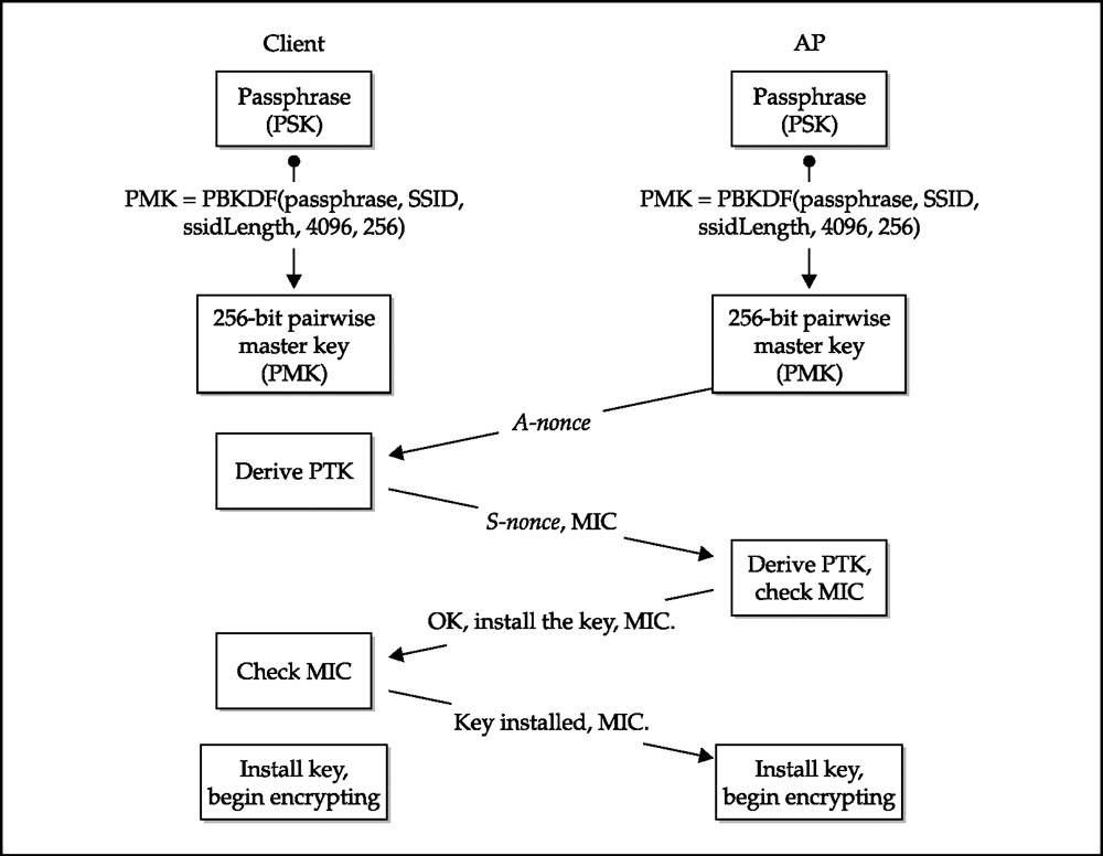 Notice that the pairwise master key (PMK) is computed from the PSK and SSID without any dynamic information. That means when you type your passphrase into the OS, it will probably not store your plaintext PSK. It will compute the PMK once and store that instead. On Windows, the PMK is stored in the registry; on Linux, it is usually stored in the wpa_supplicant.conf file. The PMK is created by hashing the passphrase 4096 times. When the IEEE created WEP, they didn't specify a technique for converting passphrases to keys, which leads to the 21-bit Newsham attack (described in the previous chapter). WPA has no such deficiency.