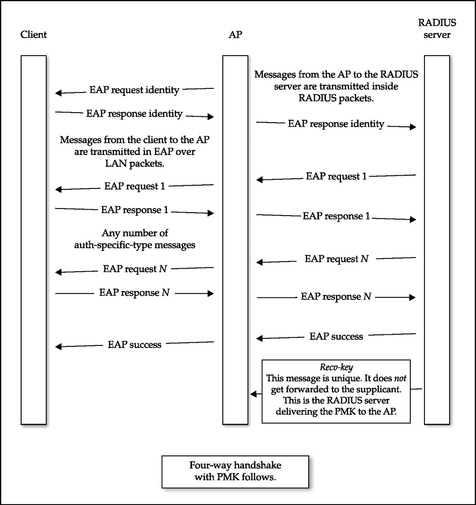 When the AP and client both have the PMK, they engage in the same four-way handshake illustrated in Figure 7-1. This process ensures both the AP and the client have the (dynamically generated) PMK. Figure 7-2 shows the enterprise-based authentication process.